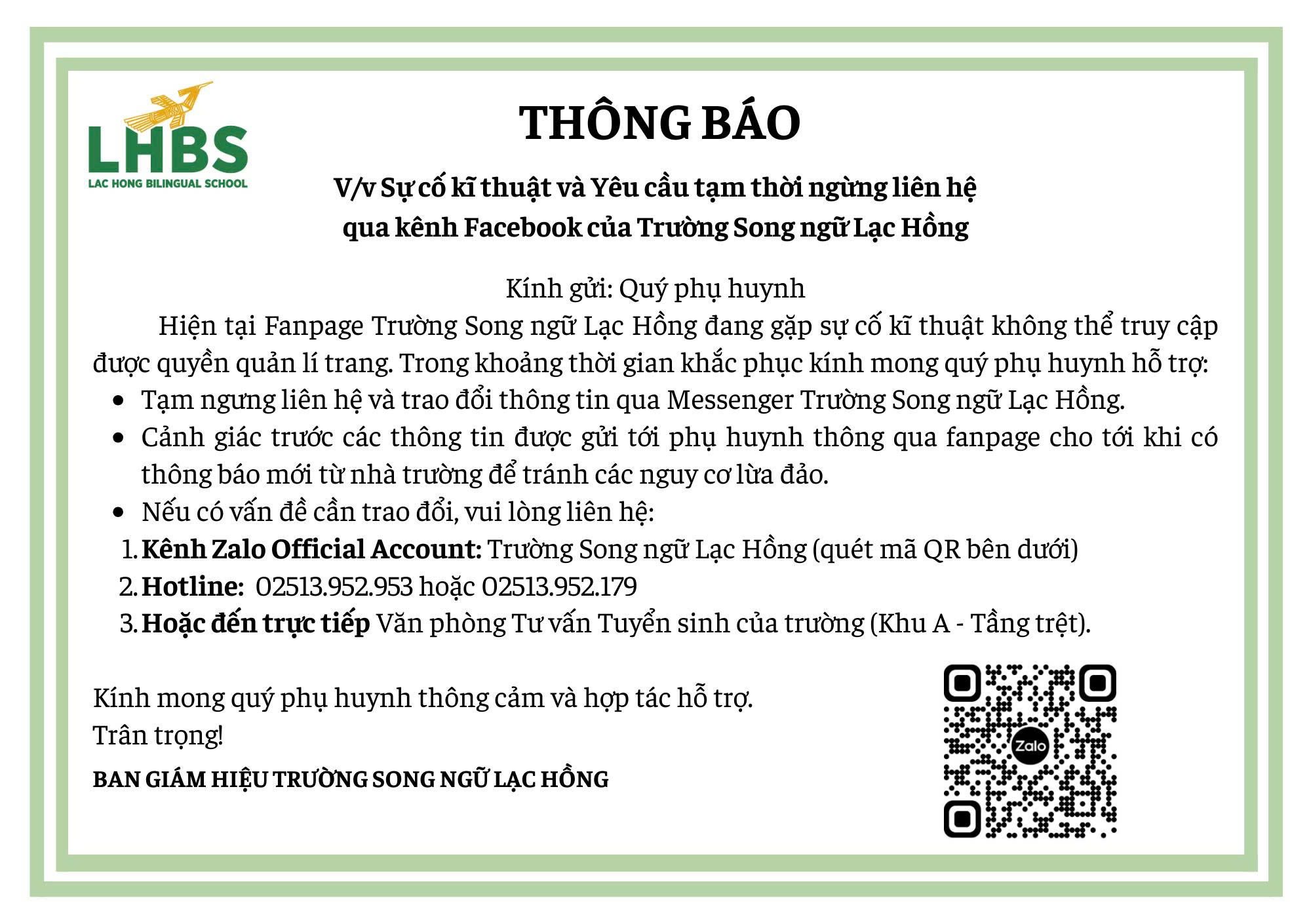 THÔNG BÁO: QUÝ PHỤ HUYNH TẠM THỜI NGƯNG LIÊN HỆ QUA KÊNH FACEBOOK CỦA TRƯỜNG SONG NGỮ LẠC HỒNG Xem thêm